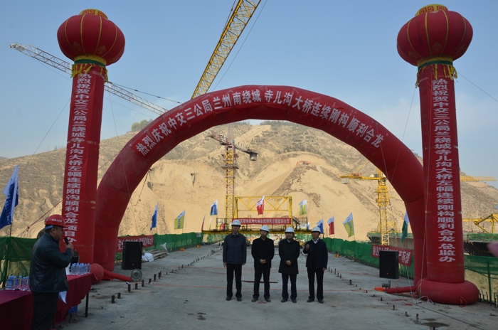 2016年11月17日,由中交第三公路工程局承建的蘭州南繞城LRN12合同段寺兒溝大橋左幅中跨順利合攏,并舉行了簡(jiǎn)短的合攏儀式。中國(guó)交通建設(shè)集團(tuán)路橋交通事業(yè)部總工李宗平,中交三公局總工于根社和蘭州南繞城項(xiàng)目主要負(fù)責(zé)人及參建單位代表出席了儀式。