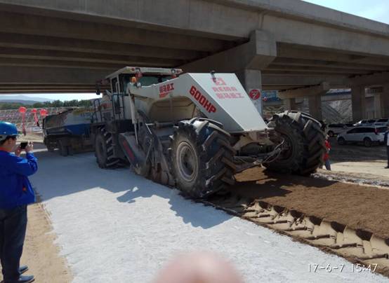 在觀摩現(xiàn)場,LRN07合同段工作人員從路基工程概況、施工準備和施工過程等方面,對灰土路基標準化施工工藝做了詳細的講解,并現(xiàn)場對路基石灰撒布車撒布、冷再生路拌機補水翻拌、成型碾壓等關(guān)鍵工藝進行了施工演示,對施工控制難點進行了分析總結(jié)。項目辦對該套工藝工法高度肯定,要求參建單位要相互學習,加強管控,從設備配置、原材料檢測和工藝工法等方面狠抓路基灰土施工,保證工程質(zhì)量。