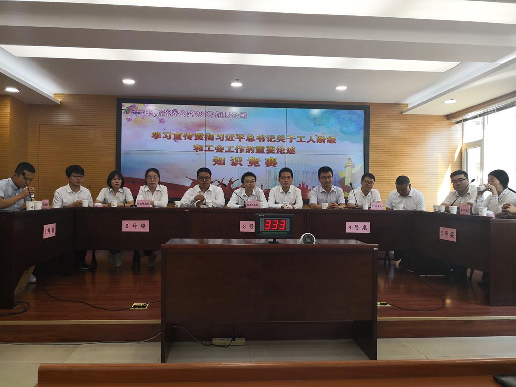 為積極響應(yīng)省公航旅集團(tuán)公司《關(guān)于開展學(xué)習(xí)宣傳貫徹習(xí)近平總書記關(guān)于工人階級和工會工作的重要論述知識競賽的通知》精神,進(jìn)一步深入宣傳貫徹黨的十九大和工會十七大精神,深刻領(lǐng)會習(xí)近平總書記關(guān)于工人階級和工會工作的重要論述及“不忘初心、牢記使命”主題教育的學(xué)習(xí)內(nèi)容,完成中國工會十七大目標(biāo)任務(wù),緊緊圍繞“忠誠黨的事業(yè)、竭誠服務(wù)職工、引導(dǎo)職工群眾聽黨話、跟黨走”主題,激勵公司廣大職工,以昂揚的精神狀態(tài),投身公司項目建設(shè)事業(yè),為集團(tuán)公司高質(zhì)量發(fā)展、建設(shè)幸福美好新甘肅貢獻(xiàn)力量,2019年7月10日,路投公司舉辦了“學(xué)習(xí)宣傳貫徹習(xí)近平總書記關(guān)于工人階級和工會工作的重要論述”知識競賽活動。